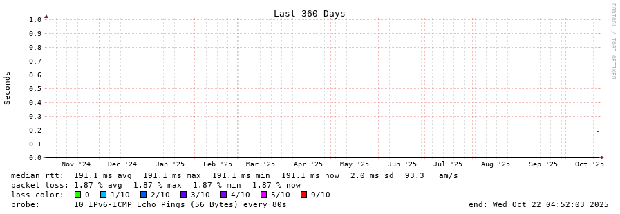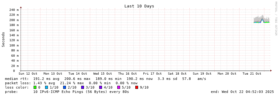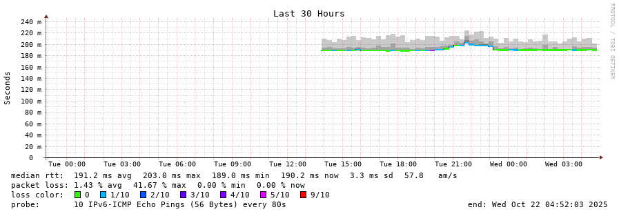 traceroute to 2001:470:1f13:814:1ad6:c7ff:fe2a:502 (2001:470:1f13:814:1ad6:c7ff:fe2a:502), 30 hops max, 80 byte packets - Generated at 2025-10-22 04:30:01