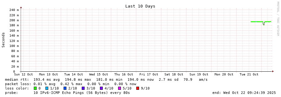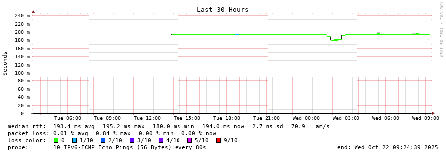 traceroute to 2a0c:9a40:8610:e3f::1 (2a0c:9a40:8610:e3f::1), 30 hops max, 80 byte packets - Generated at 2025-10-22 01:00:01